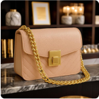 Prompt: Luxury boutique counter with marble, dark wood, and warm lighting. Minimal, elegant setting to highlight premium handbags with style and sophistication.