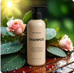 Prompt: On a wooden surface, surrounded by fresh dewdrop-covered roses and eucalyptus leaves, soft light and blurred green garden background. - Name: Premium