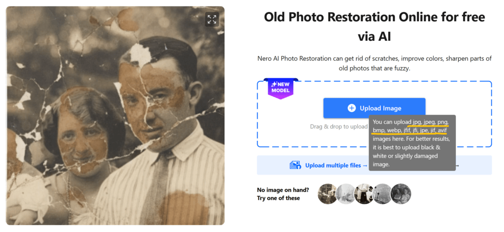 Drag and drop your damaged photo into Nero AI Fotowiederherstellung, or click to browse your files. We support all common formats: JPEG, PNG, BMP, WEBP, and so on.