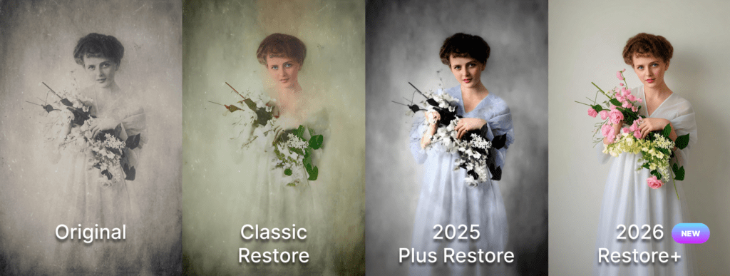 Dramatically improved colorization – We’ve improved color accuracy and naturalness. Our AI now produces colors so lifelike that restored photos often look better than the originals. Advanced scene understanding respects historical context — clothing looks more vibrant, skin tones vary naturally across different individuals and lighting conditions.
