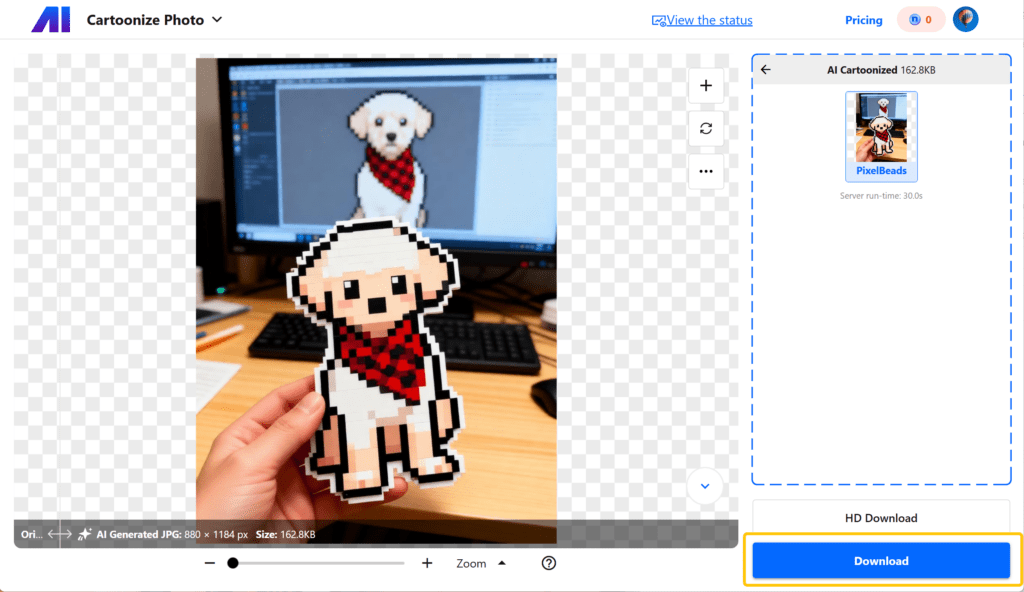 Perfect Inspiration: Seeing your realistic photo transform into pixelated cartoon art sparks creative ideas. The AI transformation shows you what’s possible in Perler bead form, inspiring your next physical craft project.